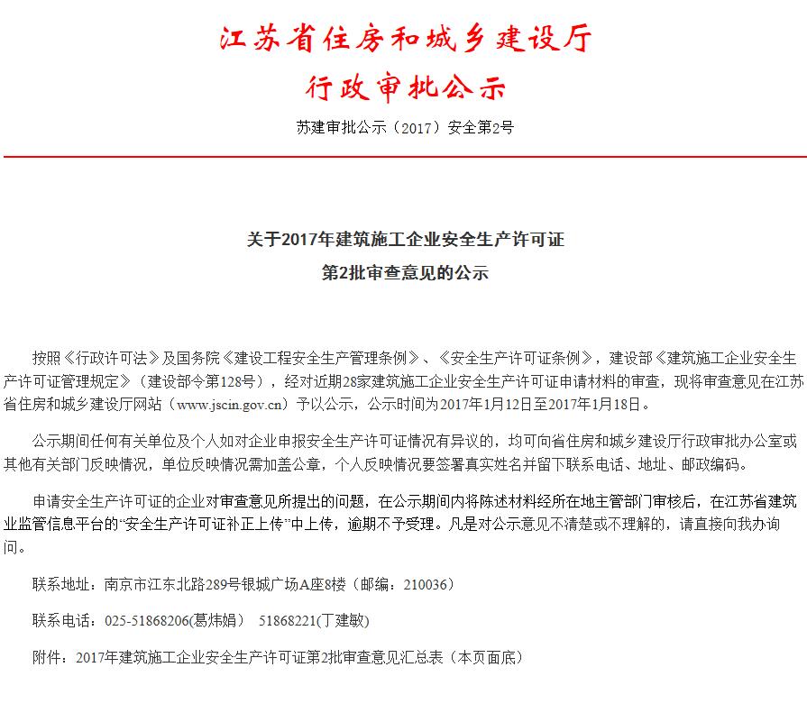 江蘇省住建廳行政審批公示--關(guān)于2017建筑施工安全生產(chǎn)許可第2批審查意見(jiàn)公示